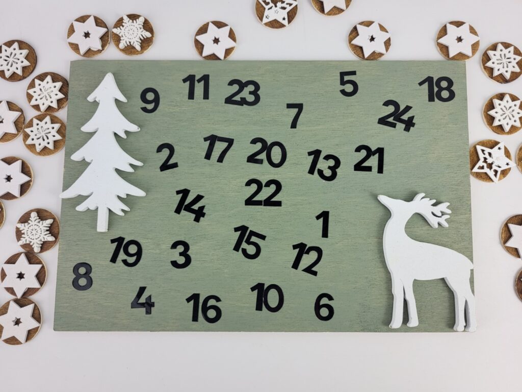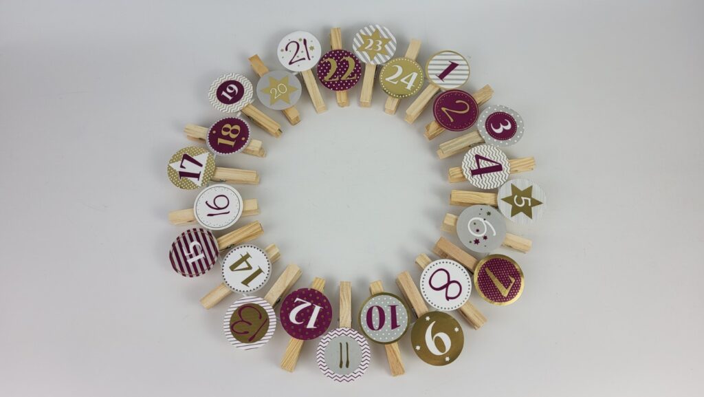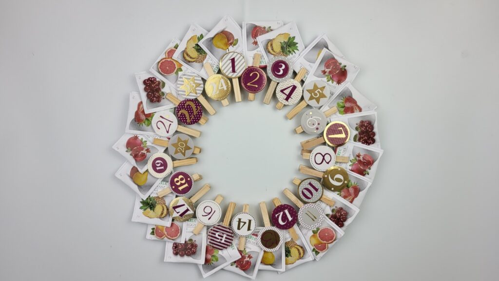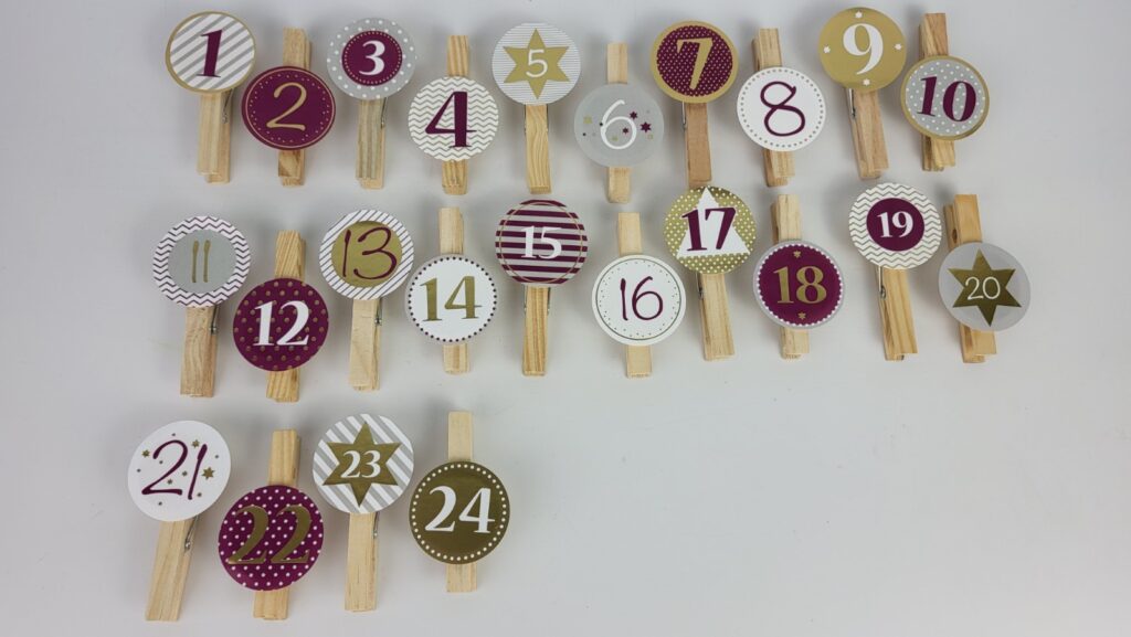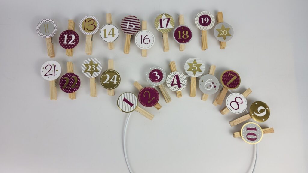 Ezt követően betekertem az akasztókat a helyükre és felakasztottam a számozott kártyákat. Végül az egészet karikákkal rögzítettem a karácsonyi táblához és ezzel el is készültem.