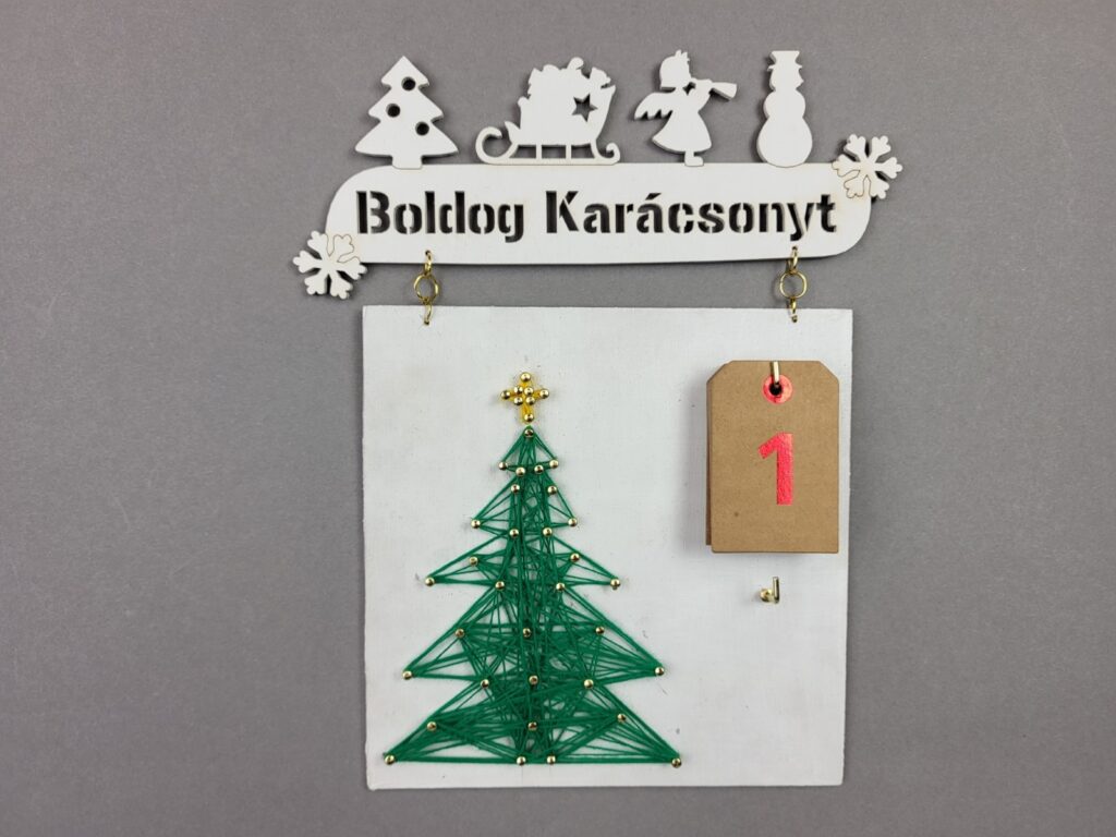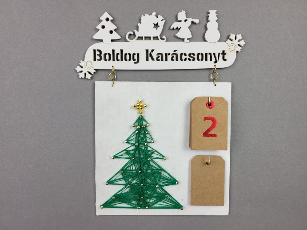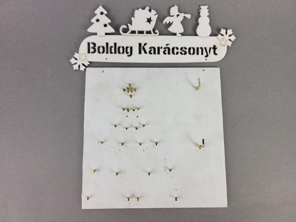 Az elkészítést a rétegelt lemez fehérre festésével kezdtem. Majd a száradás után megterveztem a fenyőfa és a kártyák helyét. Megjelöltem a szegek és akasztó helyét. Majd ezekben a pontokban kifúrtam a lapot. A szögeknél érdemes figyelni a hosszúságukra és ha szükséges levágni őket, hogy ne lógjanak túl.
