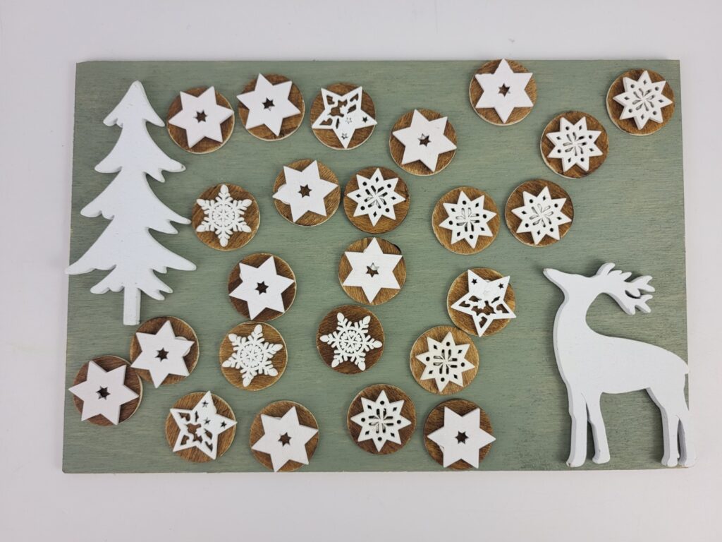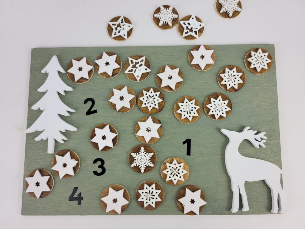 Ez egy szórakoztató adventi naptár, modern színekben. A naptár egy memóriajáték is egyben. Az adventi napok haladtával egy-egy korongot kell levenni, azonban a kihívás, a helyes megtalálása.