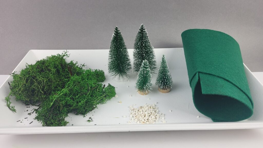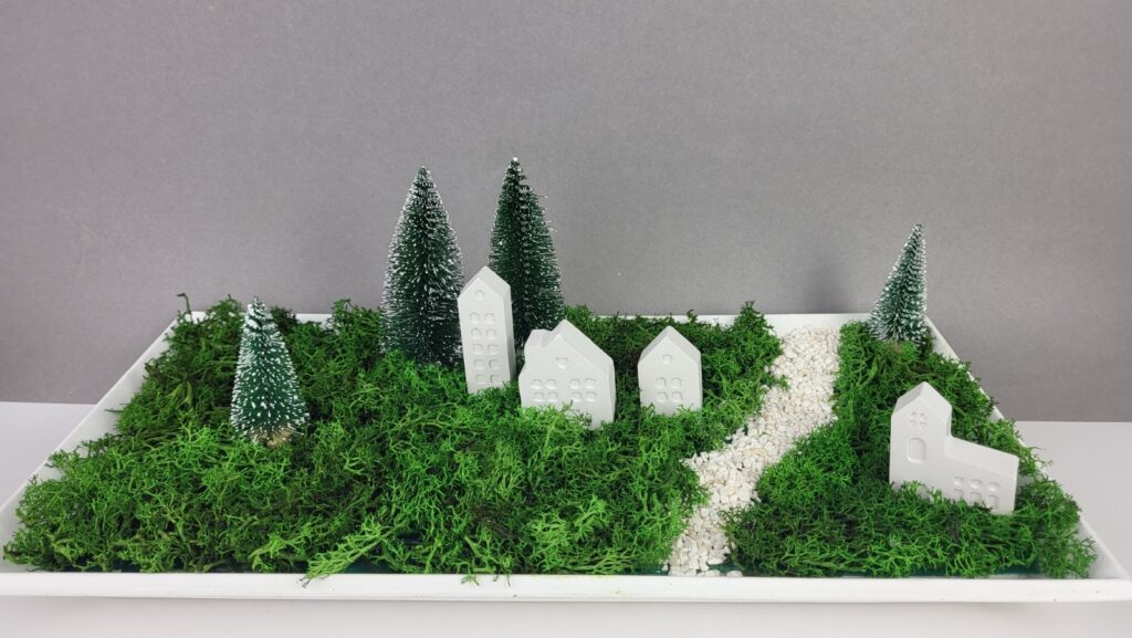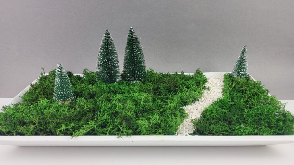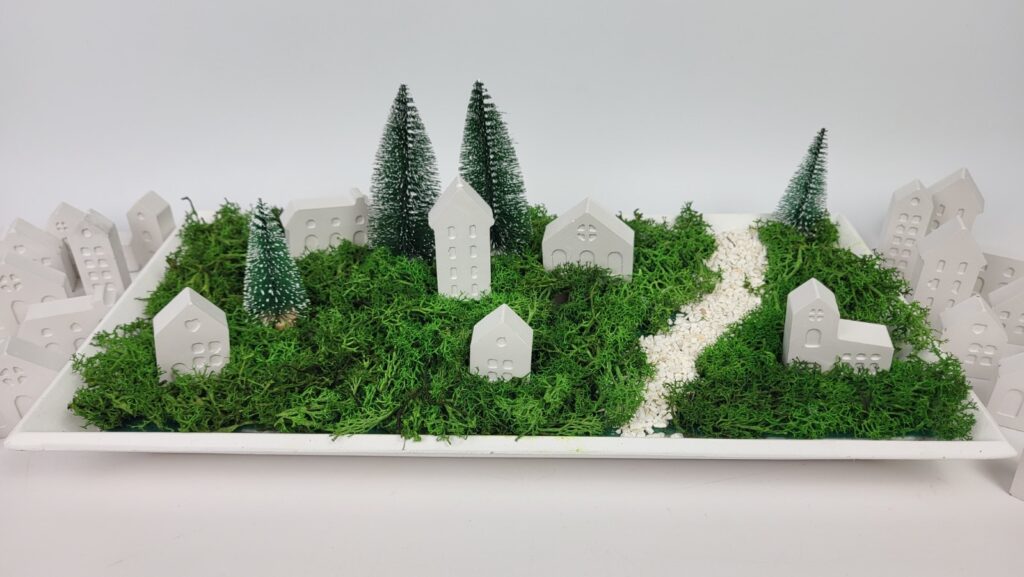 A hungarocell tetejét bevontam zöld filcanyaggal, majd zuzmóval borítottam be. A filc segít, hogy egységes zöld felületet kapjunk és esetleg ne látszódjon ki a fehér. A tájban kialakítottam egy utacskát is, amihez fehér apró kavicsot használtam. Végül pár műfenyőt helyeztem el, hogy összeálljon a télies táj.