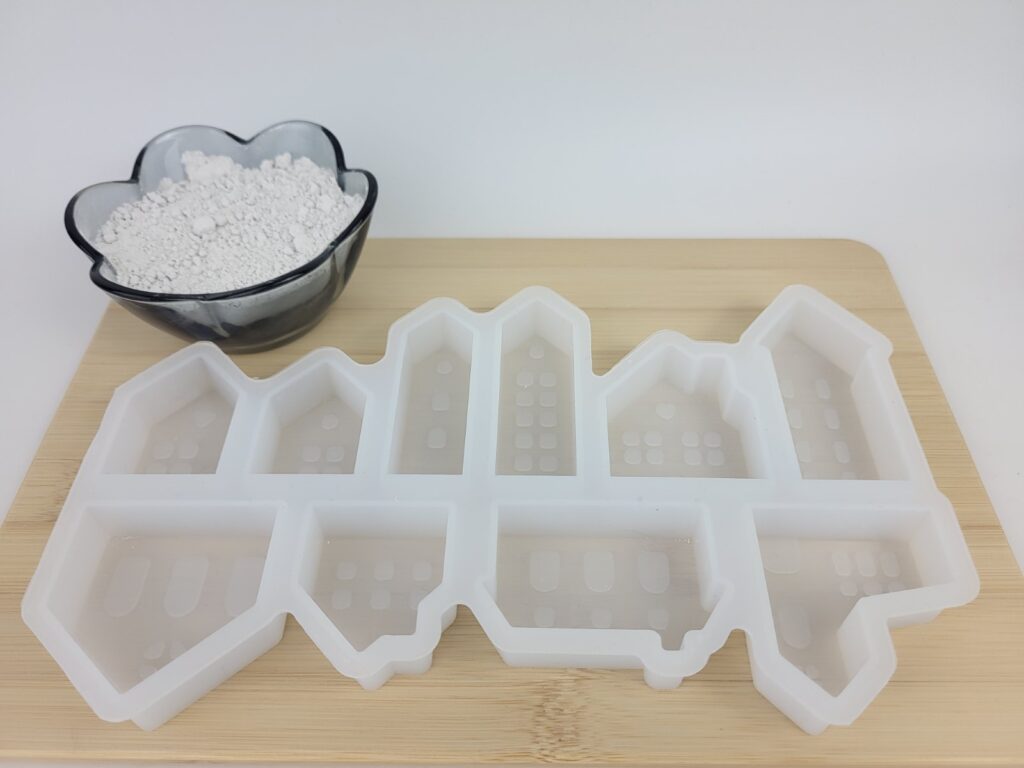 24 apró házikót öntöttem, amelyek napról napra felkerülnek egy kis téli tájrészletet ábrázoló tálcára. Ahogy telnek a napok, lassan felépül egy egész ünnepi falu.