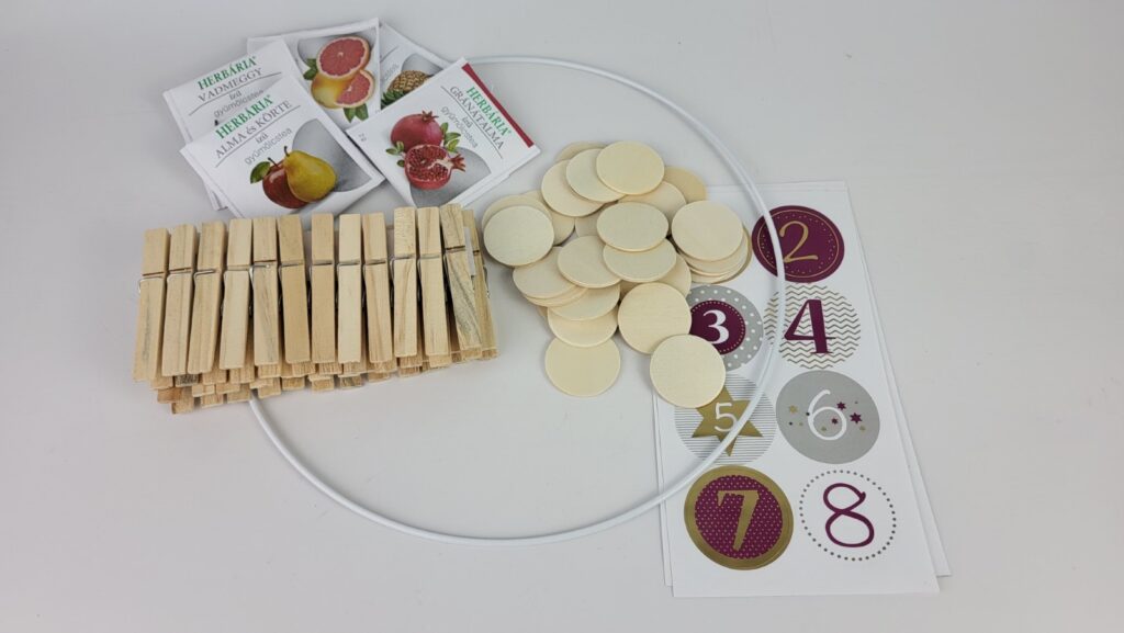 Minden hozzávaló beszerezhető egy hobbiboltban vagy akár otthon megtalálható alternatívákat is használhatsz. Én egy fehér 25cm-es fém karikát használtam, mivel így elférnek a csipeszek és tartalmuk is. Átlagos, ruha csipeszeket választottam.