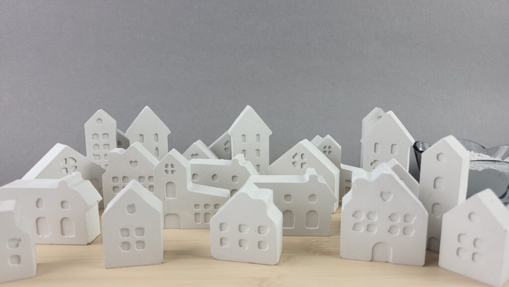 Először öntöttem 24 db házikót. Ehhez a gipszet összekevertem a vízzel, úgyhogy egy közepesen sűrű masszát kapjak.