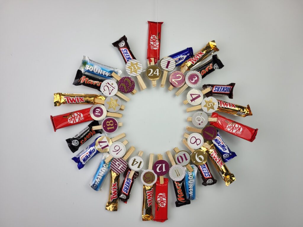 Ennek az adventi naptárnak az előnye, hogy szinte bármit belehelyezhetünk, egyedül arra érdemes figyelni, hogy a csipeszek elbírják.