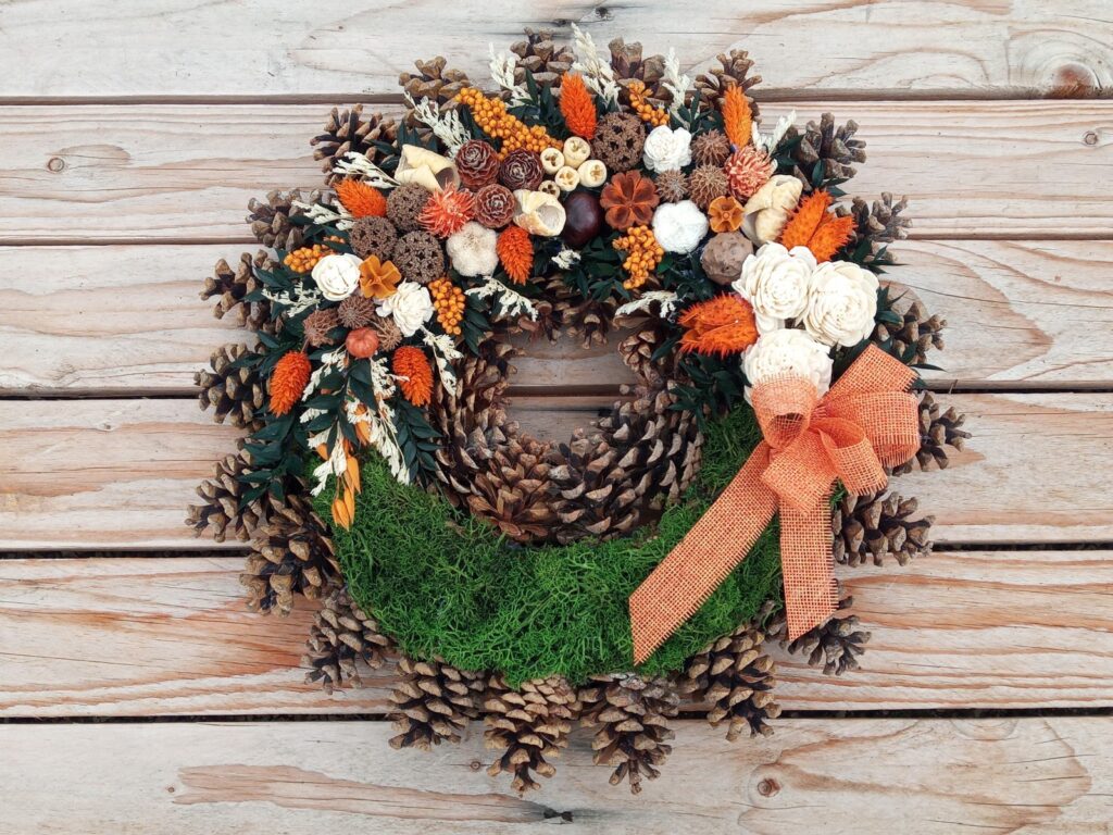 A tobozkoszorú az egyik hagyományos mindenszenteki alap. A díszítése viszont modern. Olyan, mintha egy fekvő csokor lenne az alapon.