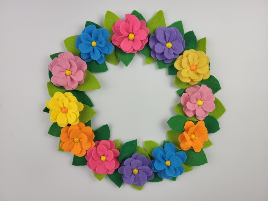 Ennek az ajtódísznek az alapját egy műagyag karika adja, amire színes filc anyagból kivágott virágok kerültek. A filc könnyen formázható, jól vágható és tartós alapanyag, így ideális választás akár kezdők számára is.